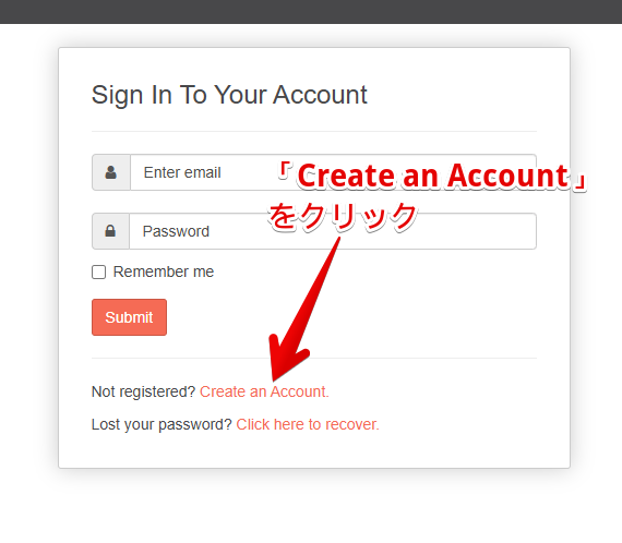 アカウントを既に持っているならメールアドレス&パスワードを入力してSubmit、アカウントを持っていない場合は作成する必要があるので「Create an Account」をクリックします。