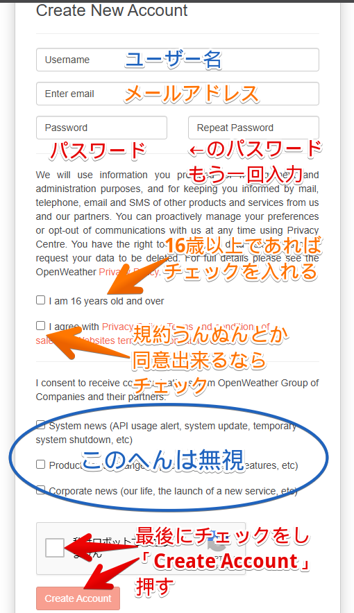 なおOpenWeatherの登録は16歳以上でなければなりません。16歳未満の人は親に代行してもらうか、諦めてください。