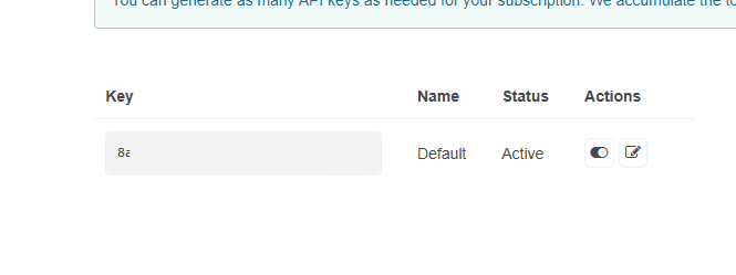 なおこのAPIキーは他の人に教えたりしてはいけません。もし教えてしまった場合は画像には写ってませんがAPI keysの項目にある「Create key」のボタンから新しいAPIキーを生成して、教えてしまったキーはActionsの項目にある✖ボタンからキーを削除してください。