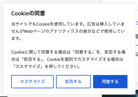 全部同意する場合は「同意する」嫌なら「拒否する」(全てのCookieを受け入れない)カテゴリごとに受け入れるCookieを選びたい場合は「カスタマイズ」を選択します。