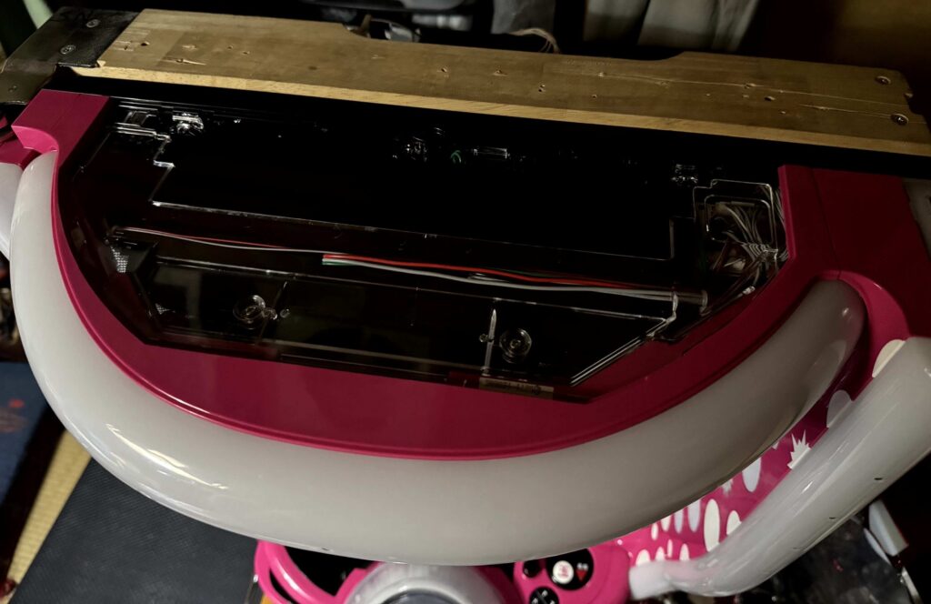 届いた時はパチンコ台上部に設置する鉈ユニットは外されていました。正直これなくても遊べますが、せっかく付いてきたやつなので設置します。